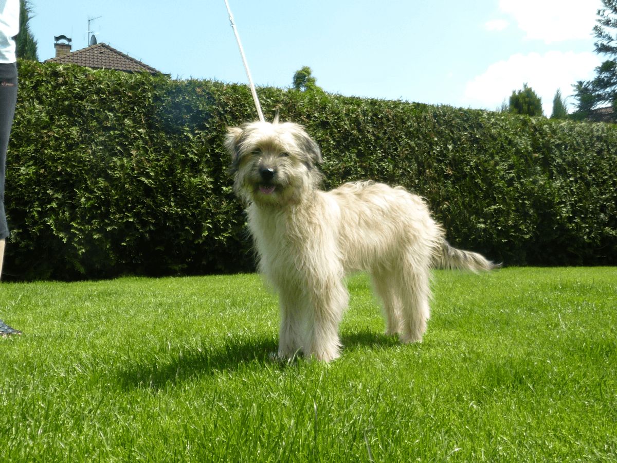 HAIR : Long, or semi-long, but always dense, almost flat or slightly wavy, thicker and woollier on the croup and thighs, texture somewhere between goat’s hair and sheep’s wool. In some dogs the mixture of coarse and woolly hair can produce sorts of strands or cords called “cadenettes" and sometimes matted or felted hair called “matelotes” which overlap like tiles on the croup. “Cadenettes” can be found on the chest and the forelegs at elbow level. The muzzle has shorter, less dense hair.
