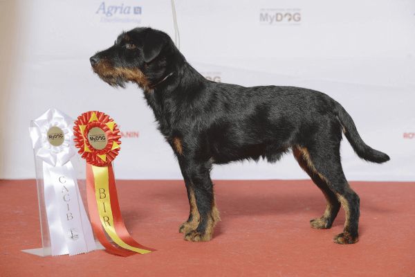 BRIEF HISTORICAL SUMMARY : After the first World War a group of active hunters separated from the numerically strong Fox Terrier Club. It was their aim to create a breed, the sole purpose of which would be hunting performance. The experienced hunters and cynologists Rudolf Frieß, Walter Zangenberg and Carl Erich Grünewald decided to select a black and tan hunting dog in particular suitable for the hunt under the ground. A coincidence came in support of their efforts. A zoo director, Lutz Heck / Hagenberg presented Walter Zangenberg with four black and tan terriers which were said to come from pure bred Fox Terrier lines. These dogs became the foundation stock of the German Hunting Terrier. At the time Dr Herbert Lackner joined the founders. After many years of intensive breeding efforts, and through skilful crossings with the Old English Wirehaired Terrier as well as with the Welsh Terrier, they succeeded to fix the appearance of their breed. At the same time they put great emphasis on breeding a multitalented, well trainable, hard, tongue giving and water happy dog with an explicit hunting instinct. The German Hunting Terrier Club (Deutscher Jagdterrier Club e.V.) was founded in 1926. As ever, the breeders continued to value most carefully their breed for its usefulness as a hunting dog, its steadiness of character, its courage and drive.